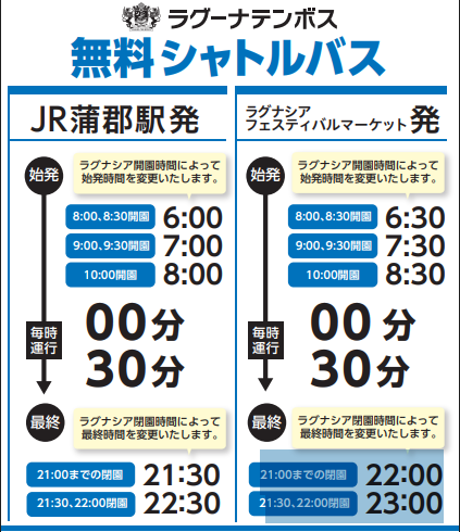 JR蒲郡駅のバス乗り場⑦番からは、ラグーナテンボスに行ける無料シャトルバスが下記の時間で運行しています!